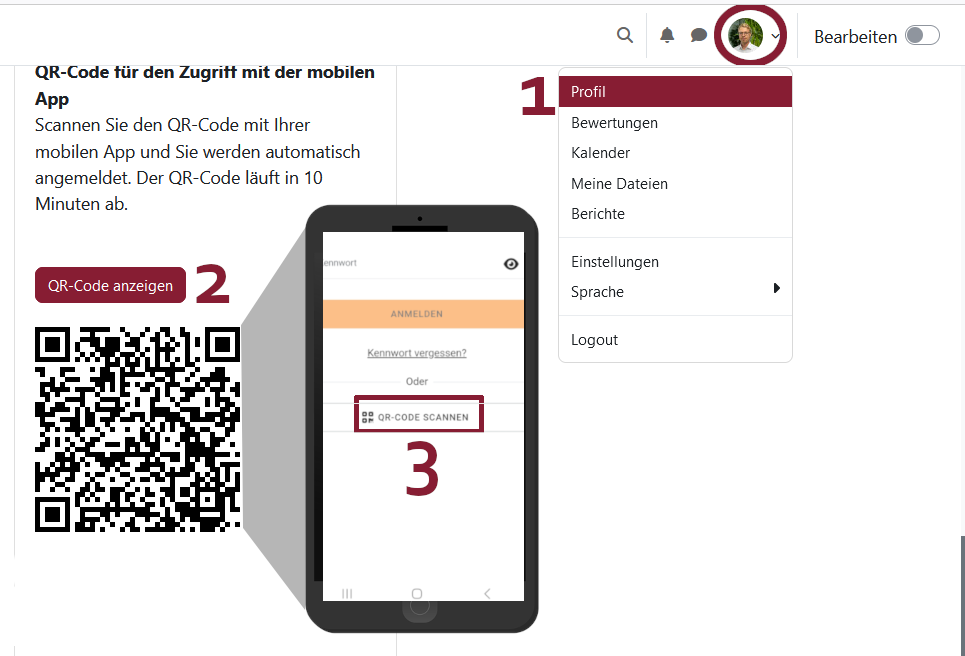 Für den einfachen Login mittels QR-Code in der mobilen App meldet man sich auf der Lernplattform im Browser an. Nachfolgend wechselt man im Browser auf das eigene Profil und wählt dort „QR-Code“ anzeigen. Nun startet man die moodle App auf dem Smartphone oder Tablet. Statt aufwändig Nutzername und Passwort abzutippen um sich in der App anzumelden, wählt man nun ganz einfach „QR-Code scannen“ im unteren Bereich der App aus und scannt den QR-Code vom eigenen Profil ab. Nachfolgend sollte der Login auf dem Smartphone übernommen werden.