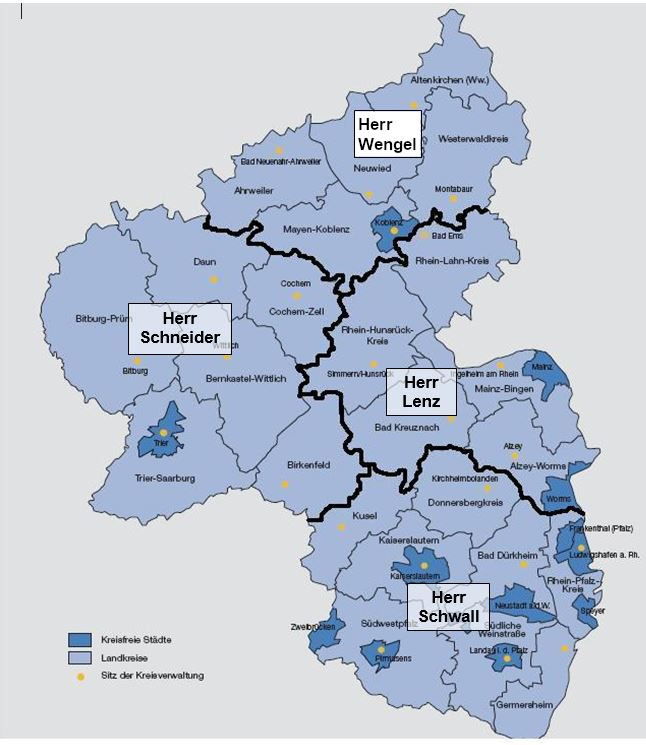 Das Land RLP ist in vier Prüfbezirke aufgeteilt. Die einzelnen Prüfbezirke sind der Karte zu entnehmen: